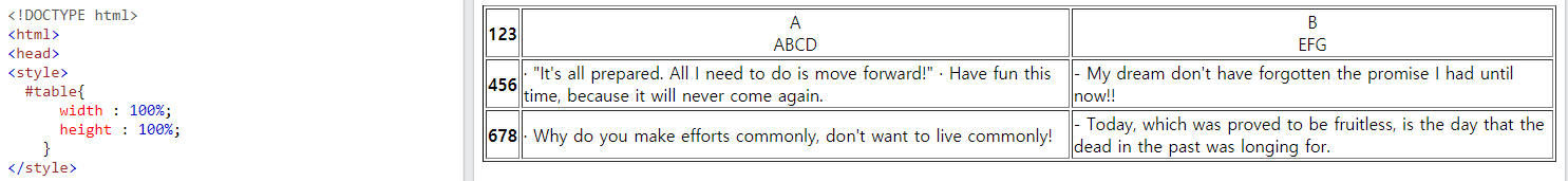 table-layout ์์ฑ๊ฐ์ fixed๋ก ์ง์ ํ๋ฉด ์ ์์ ๋ฐ์ดํฐ๊ฐ ๊ธธ์ด์ ์ง์ ํ ๋๋น ์ด์์ผ๋ก ์ ์ ์ด๊ณผํด๋ฒ๋ฆฌ๋ ๊ฒ์ ๋ฐฉ์งํ๋ค.