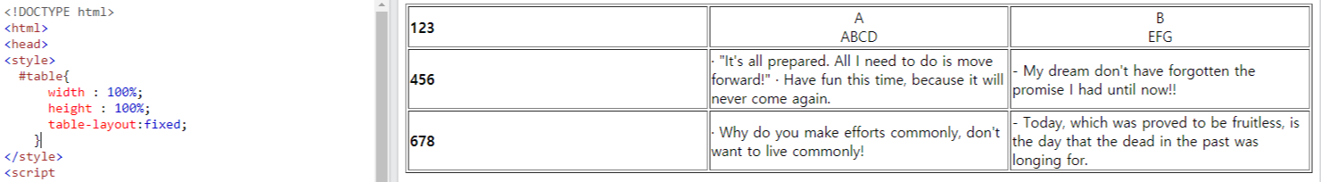 table-layout ์์ฑ๊ฐ์ fixed๋ก ์ง์ ํ๋ฉด ์ ์์ ๋ฐ์ดํฐ๊ฐ ๊ธธ์ด์ ์ง์ ํ ๋๋น ์ด์์ผ๋ก ์ ์ ์ด๊ณผํด๋ฒ๋ฆฌ๋ ๊ฒ์ ๋ฐฉ์งํ๋ค.
