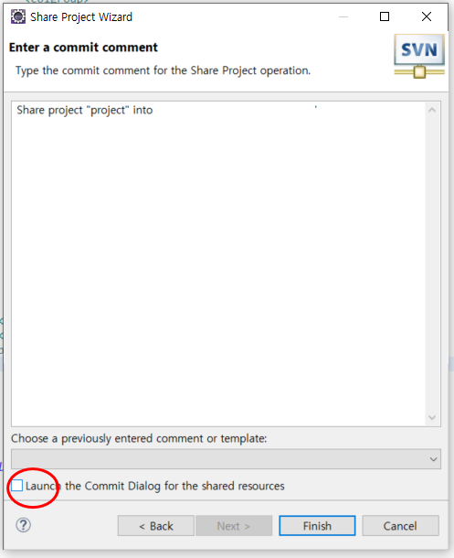 3. Launce the Commit Dialog for the shared resources 체크 해제 (커밋 여부 묻는 거)