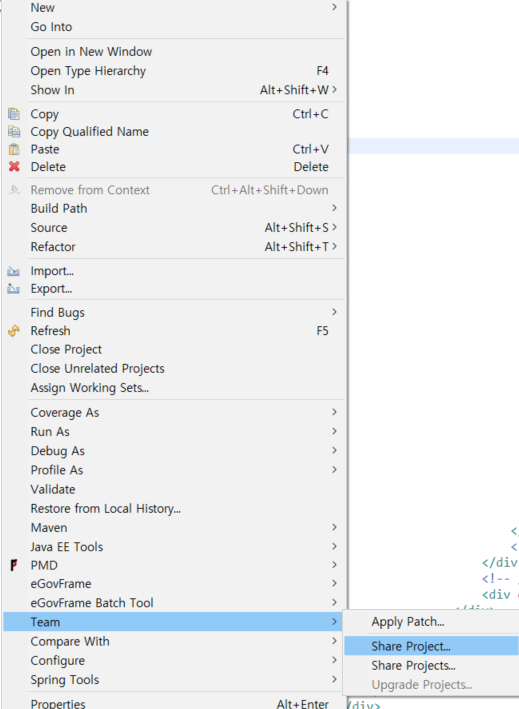 1. disconnect 후 다시 해당 프로젝트 우클릭 -> team -> share project