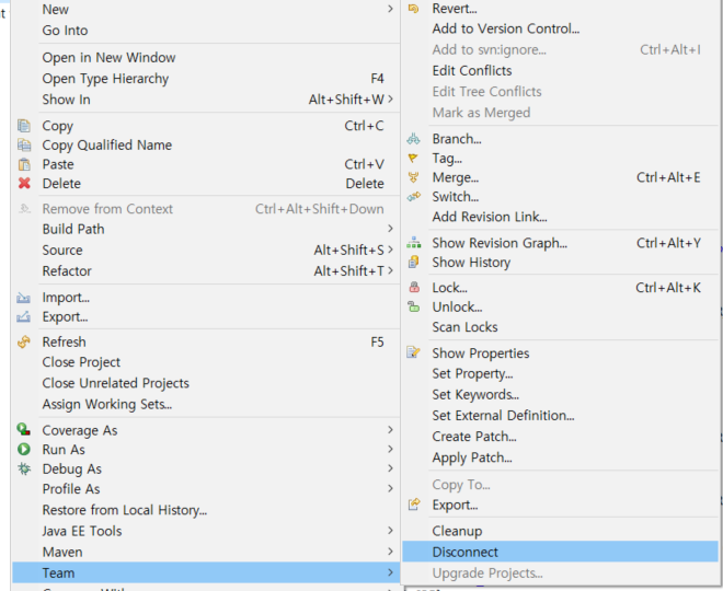 1. 프로젝트 우클릭 -> team -> Disconnect