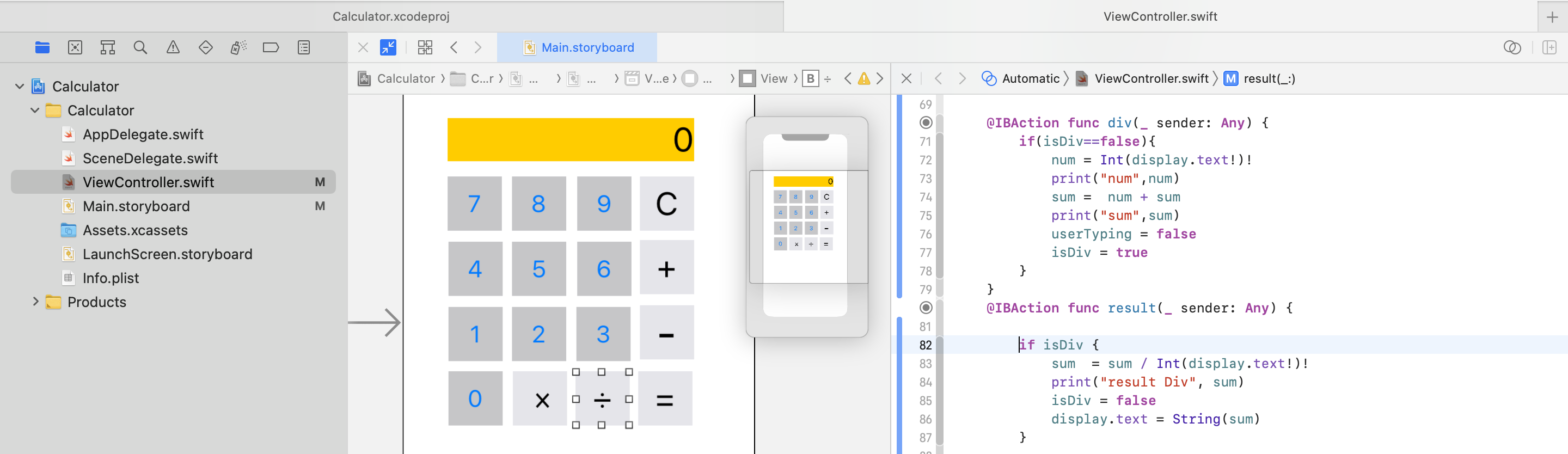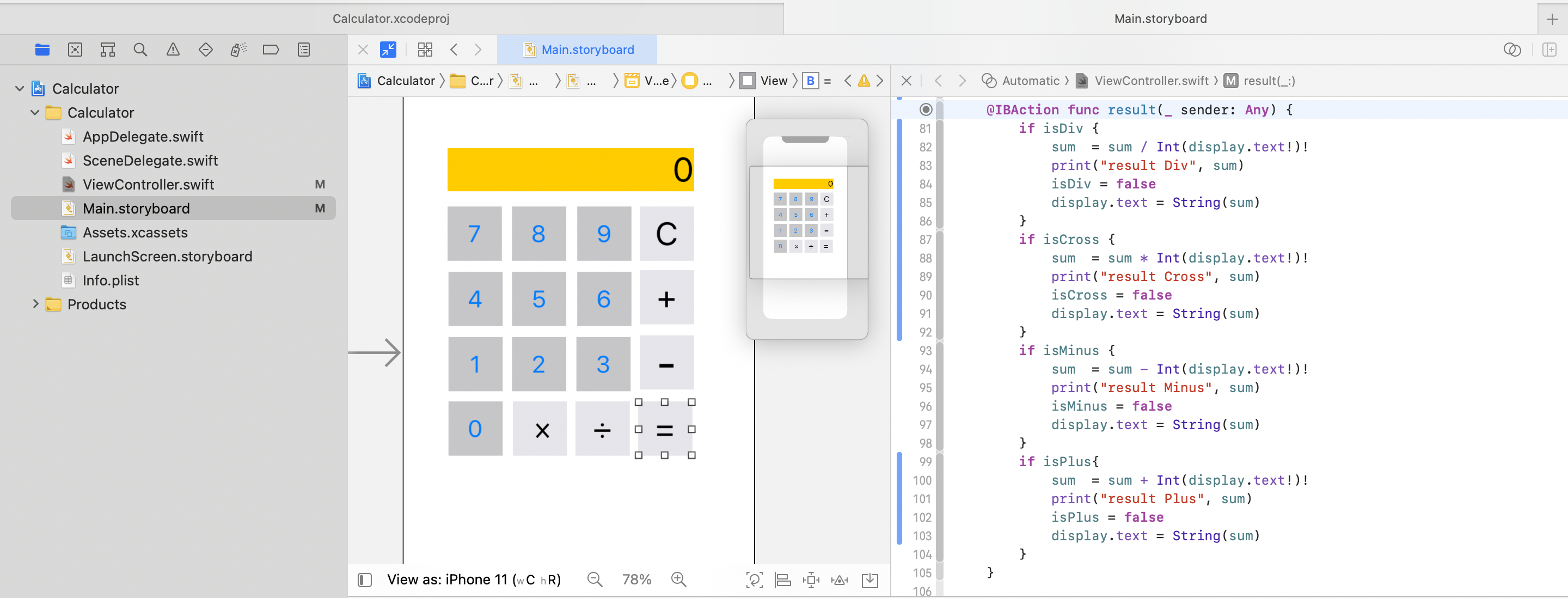 [M1 Mac] XCODE(12.5.1) swift 계산기 만들기 (1) Main.storyboard 1. 0-9까지의 버튼을 생성한다. 2. 같은 func을 연결한다. ViewController.swift 3. let digit = sender.currentTitle! String이 맞다는..
