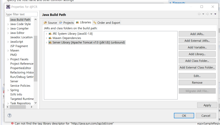 * Apache Tomcat v7.0의 Server Library를 포함하는데 현재 이클립스에는 톰캣 7 서버가 등록되어 있지 않기 때문에 unbound라고 표시.