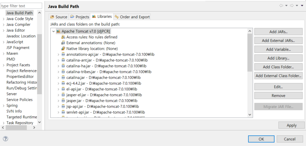 ํ๋ก์ ํธ ์ฐํด๋ฆญ - Java Build Path - Libraries - Apache Tomcat ์์น ํ์ธ