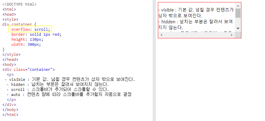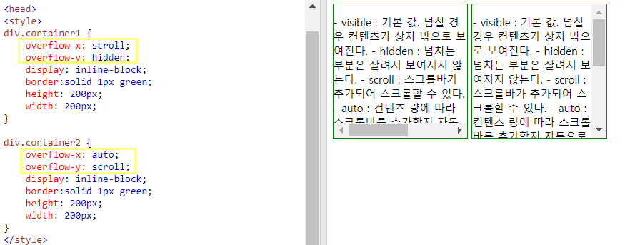 가로, 세로 overflow를 각각 제어하고자 한다면 overflow-x와 overflow-y를 사용.