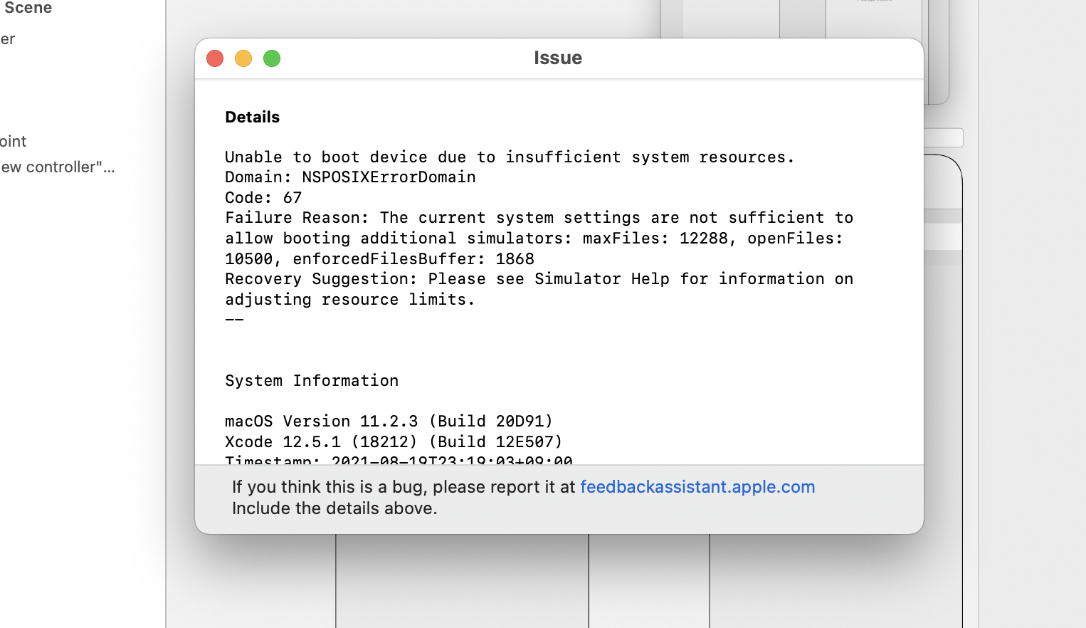 Unable to boot device due to insufficient system resources. Domain: NSPOSIXErrorDomain Code: 67 Failure Reason: The current system settings are not sufficient to allow booting additional simulators: maxFiles: 12288, openFiles: 10500, enforcedFilesBuffer: 1868 Recovery Suggestion: Please see Simulator Help for information on adjusting resource limits.