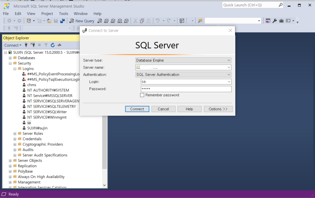SQL Server ์ค์น ์ Window ์ธ์ฆ๋ง ์ค์ ํ์๋ค๋ฉด, sa ๊ณ์ ์ด ํ์ฑํ๋์ง ์๋๋ค.
